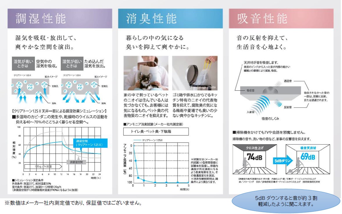 本件では、室内の快適性を高める施策として、全戸のリビング・ダイニングおよびキッチンの天井に、吸音・消臭・調湿効果のある天井材を標準仕様として採用しました。