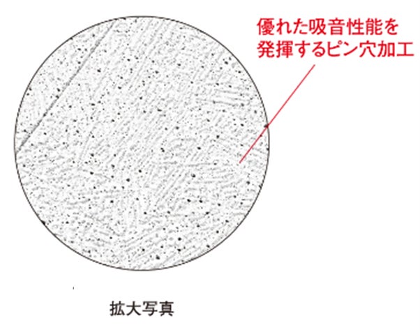 表面に数多くの吸音穴を持つ多孔質な天井材です。表面の無数の穴から入った音を内部の細かい繊維との摩擦により減衰、吸収することで残響を抑え、生活音を心地よく整えます。原材料は製鉄時の副産物であるスラグを繊維状に加工した鉱物質繊維板のため、鉱物本来の防火性能に加え、未利用資源の有効活用にも繋がっています。