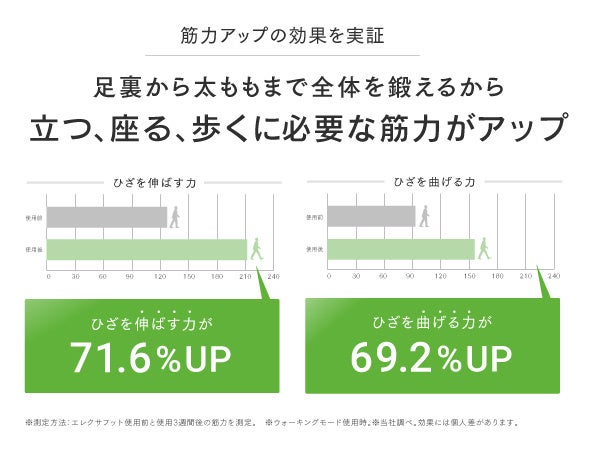 EMS電気刺激で強収縮した状態の筋肉を自力で意識的に動かすことで、縮んだ筋肉を引き延ばすように筋肉全体が普段よりも大きな力で動きます。これにより最大限のトレーニング効果を発揮し、歩行に必要な筋肉を効率的にしっかりと鍛えることができるのです。このハイブリッドトレーニング理論を直感的に、そして楽しく続けられるように「ELEXA FOOT (エレクサフット) 」が誕生しました。