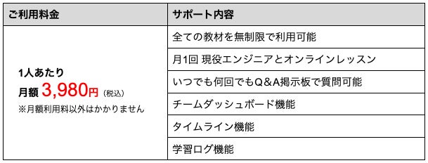 疑問をすぐに解消できる回答率100%のQ&A掲示板や、アウトプットしながら学ぶことができる40種類以上の学習教材を、1人あたり税込3,980円/月で提供します。サブスクリプション型だからこそ実現できる「いつでもどこでも使い放題」というメリットを、挫折しやすいと言われるプログラミング学習をはじめとした、多種多様なIT研修にお役立ていただけます。