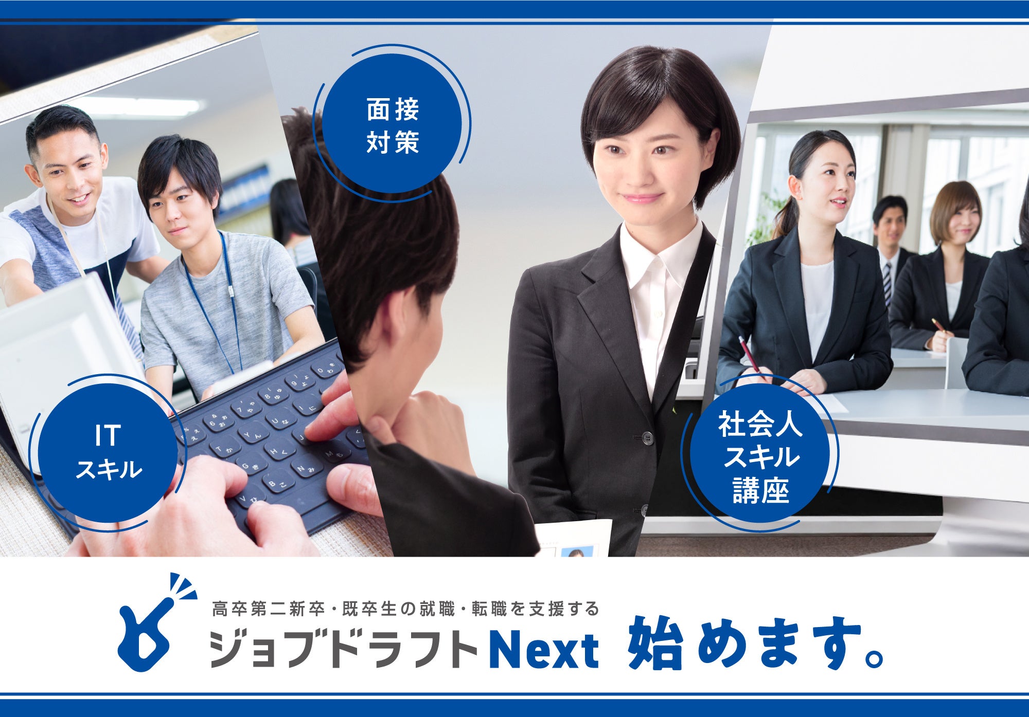 ジョブドラフトNextは、就職を希望する高卒の第二新卒者と既卒者に対して、社会人としてのマインドや面接対策などの社会人基礎力や専門スキルの講座を実施し、就職や転職を支援するサービスです。