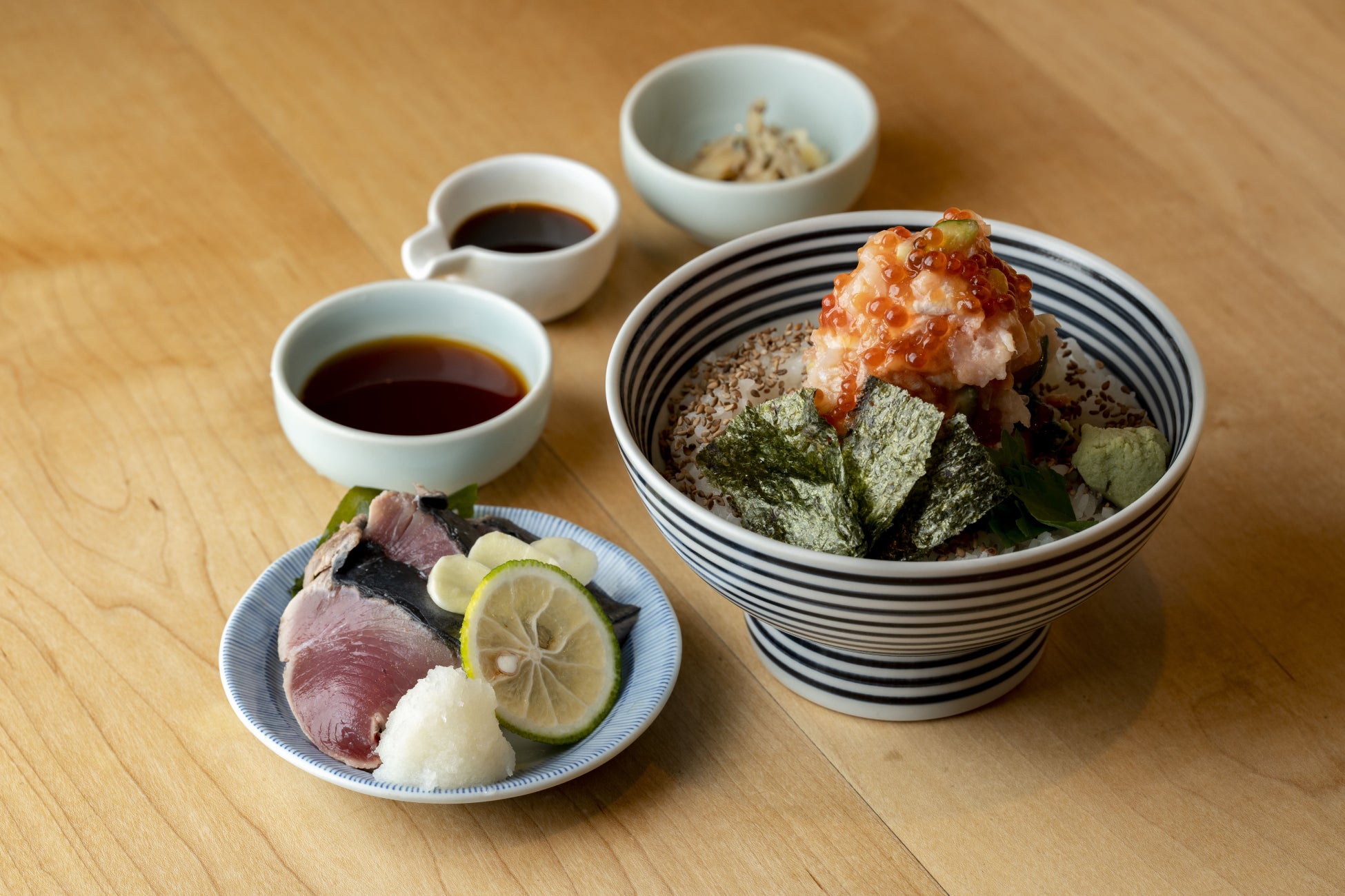 9種類の具材がのった人気の海鮮丼・梅メニューに、脂がのって一段と旨味を増した旬の鰹のタタキを添えてお出しします。皮目をパリッと焼いて分厚く切った鰹の旨さをご堪能ください。