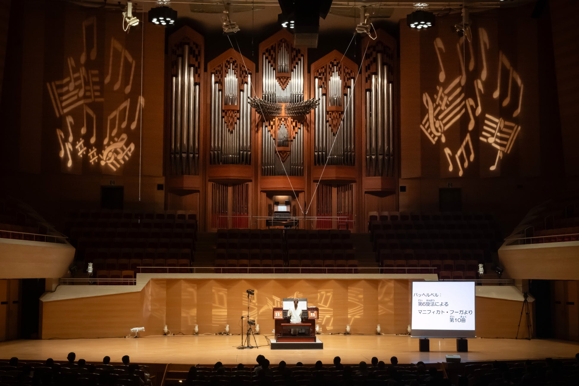 最後にはサントリーホールのステージの上へ。奏者が実際にオルガンを演奏し、舞台上ではどのようにオルガンの音が聞こえるのかを体験します。客席から聴くのとはまた違った、ホールいっぱいに広がるオルガンの響きをお楽しみください。