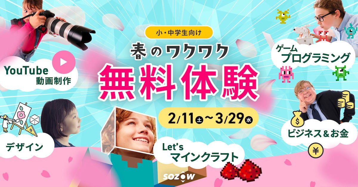 【小中学生向け】オンライン習いごと「SOZOW PARK」春の無料体験を2/11(土)〜3/29(水)に開催。マイクラ・動画制作・デザイン・ビジネスお金・ゲームプログラミングなど豊富なテーマで学べる!