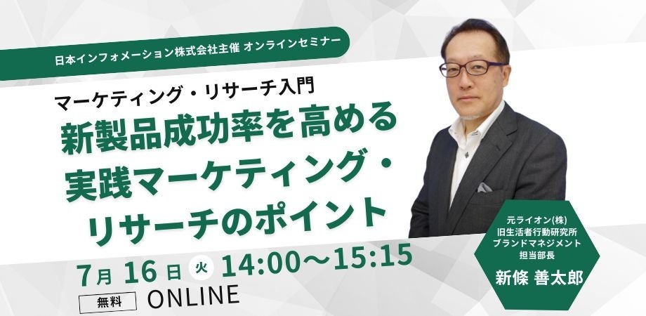 日本インフォメーション株式会社(代表取締役社長:斎藤 啓太 以下、日本インフォメーション)では「マーケティング・リサーチ入門新製品成功率を高める実践マーケティング・リサーチのポイント」と題したオンラインセミナーを開催いたします。