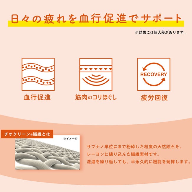 ・天然鉱石を練り込んだチオクリーン®繊維※を使用。鉱石の温熱効果により体を内から温めることで血行を促進、疲労回復へと導きます。