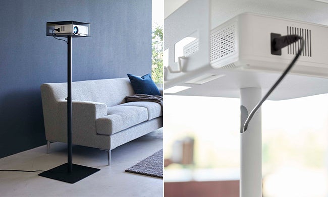 プロジェクターとリモコン類を同時に収納できる、収納付き天板のプロジェクタースタンド。