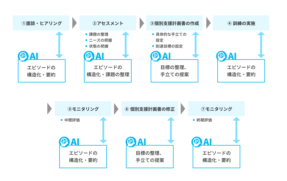 支援の現場では、利用者の状況に応じた個別支援計画を作成し、他の支援員がその内容を確認、把握するため、論理的かつ定量的に情報を集約する必要があります。しかしこれまで支援員が利用者からヒアリングした内容は、支援員の主観で作成されやすく、構造化されていないことが業界全体の課題としてあります。また個別支援計画書の作成、面談や支援の記録には、支援者のスキルによって所要時間やクオリティが異なる状況もあります。