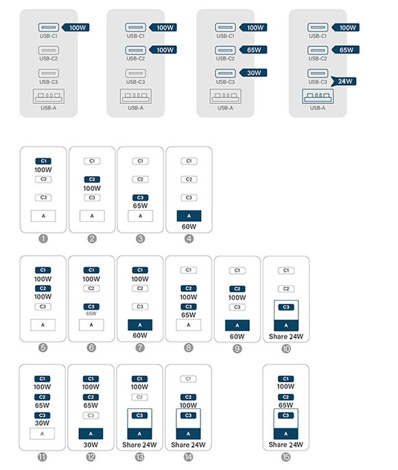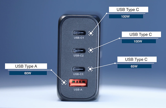 USB-Aを含めた4ポートを同時に使うと、“100W:65W:(C3+USB-Aの合計で)24W”という配分になり、USB-C1ではどのような場合でも必ず最大100Wが確保され、USB-C2においても65Wが確保されます。