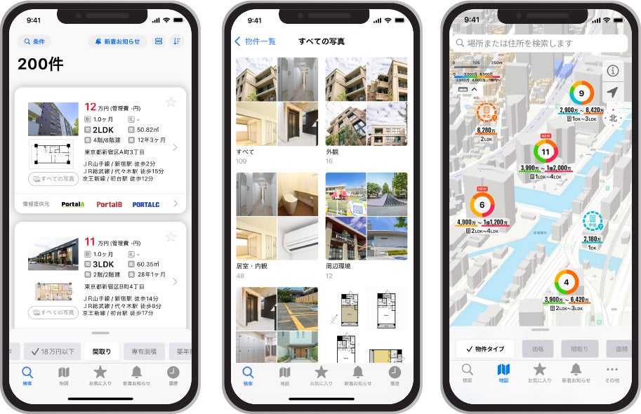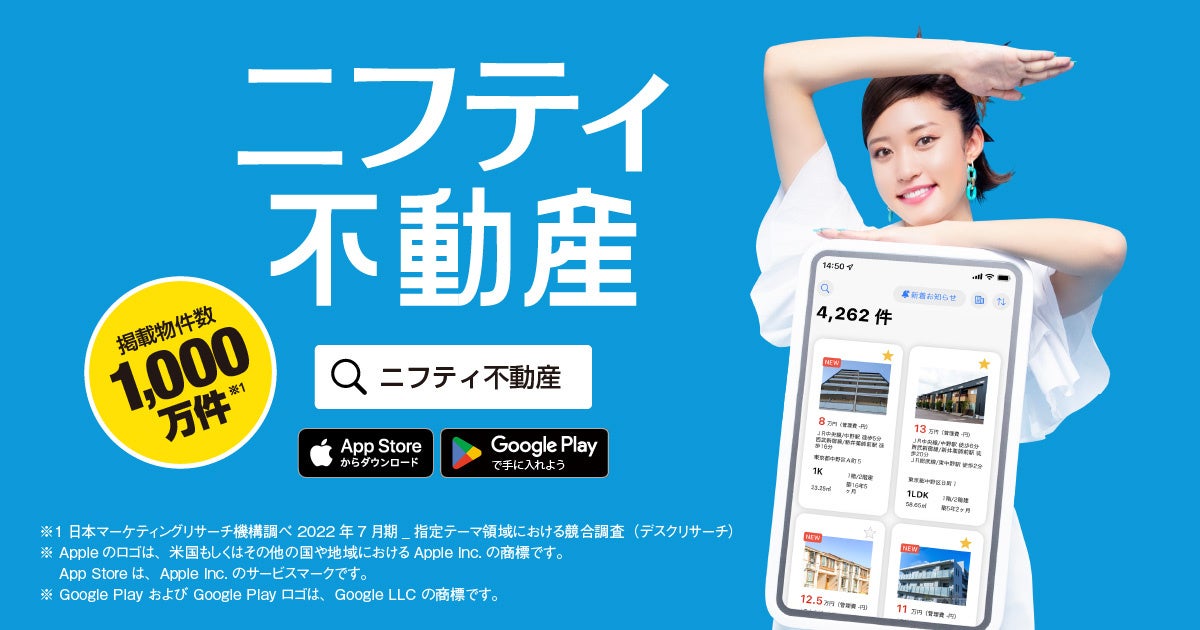 「ニフティ不動産」は、有名不動産ポータルサイトに掲載されている物件情報延べ1,000万件以上(注1)を束ねる国内最大級の不動産物件情報検索プラットフォームです。累計ダウンロード数900万(注1)のニフティ不動産アプリでは、130項目以上から選べるこだわり条件を設定して、いろいろな不動産ポータルサイトの膨大な情報から、まとめてさくさくと一括検索できることが特長です。