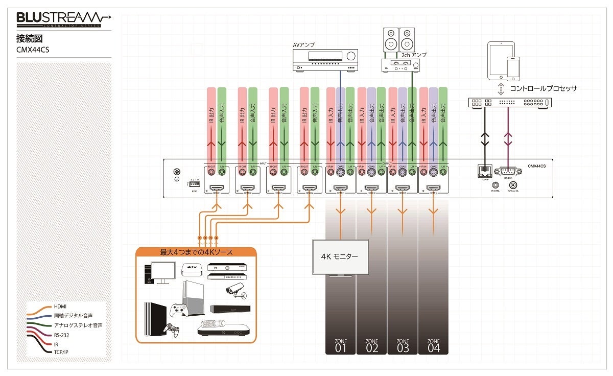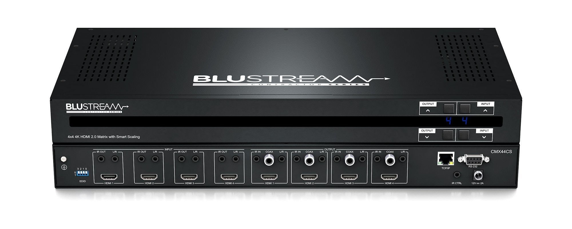 シンプルなインターフェイスでありながら多彩な制御方法に対応し、自動ダウンスケーリング出力機能を搭載したCMX44CSは、デジタルサイネージ、会議室、病院、教室、セキュリティやコントロール室の監視用などの常設設備に最適な4入力4出力4K HDMI対応のマトリックススイッチャーです。