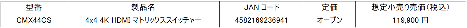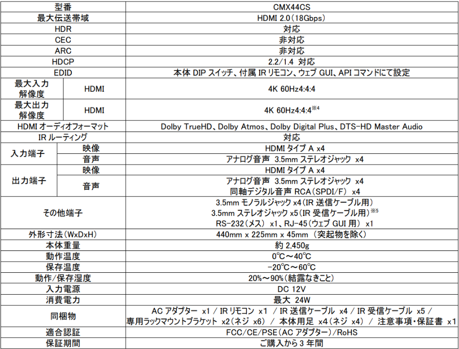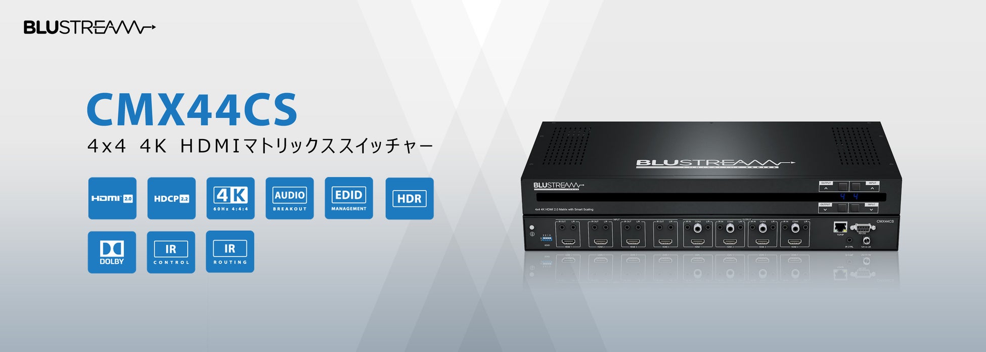 CMX44CSは、最大18Gbps(4K60Hz 4:4:4)までのHDMI信号に対応する4入力4出力HDMIマトリックススイッチャーです。