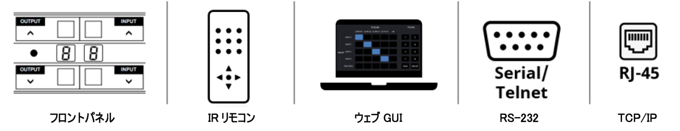 (フロントパネル、IRリモコン、RS-232、TCP/IP、ウェブGUI)