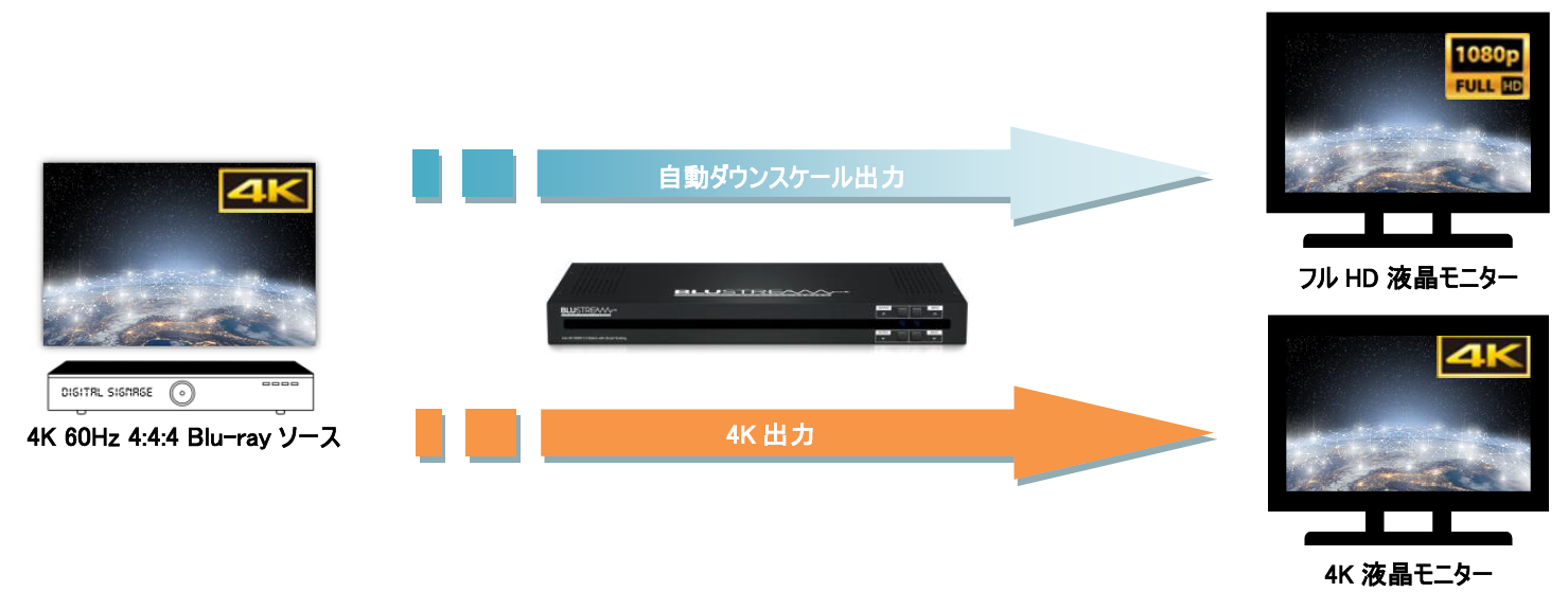 自動ダウンスケーリング出力機能搭載で4K液晶モニターやフルHD液晶モニター等が混在した接続環境でも、接続された映像表示機器に適した映像フォーマットにて表示が可能です。※1 ※2