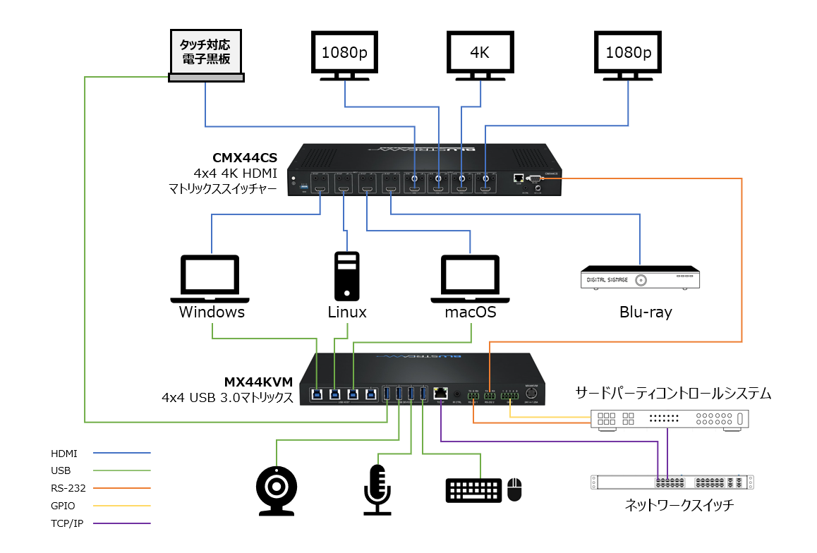 また、Blustream製品はソース切り替え用のRS-232コマンドが統一されているため、シリアル(RS-232)通信コマンドパススルー機能を搭載した、4x4 USB 3.0 KVMマトリックス[型番:MX44KVM]と接続することで、HDMIとUSB 3.0信号を同時に制御可能なKVM(Keyboard、Video、Mouse)システムの構築が可能です。