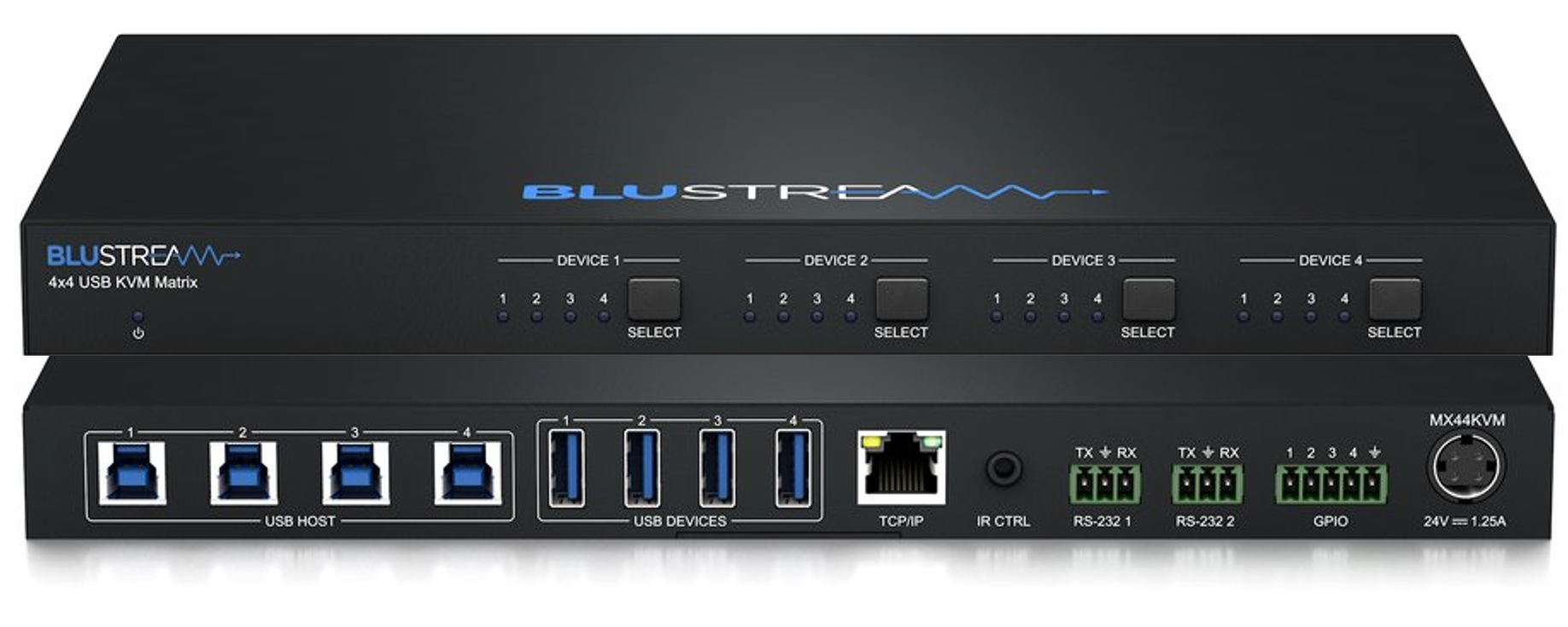 MX44KVMは、最大4台のホストPC間でUSBデバイスを切り替え・共有が可能なBlustream製4x4 USB 3.0 KVMマトリックスデバイスです。