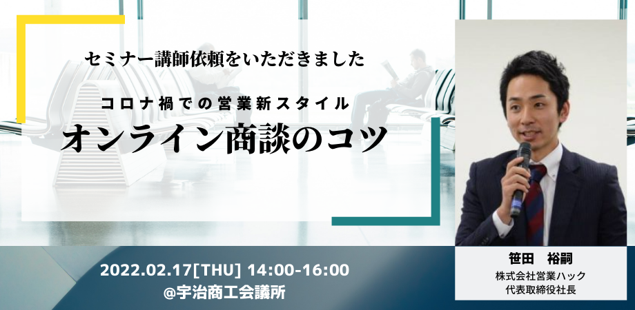 「2年で売上を2倍にする」を掲げ、営業コンサルティング行っている株式会社営業ハック(本社:東京都港区、代表取締役:笹田裕嗣)。代表の笹田が、コロナ禍における営業の一手としてオンライン商談を考えている企業に向けて、京都府宇治商工会議所よりご依頼をいただき、セミナーを開催いたしました。