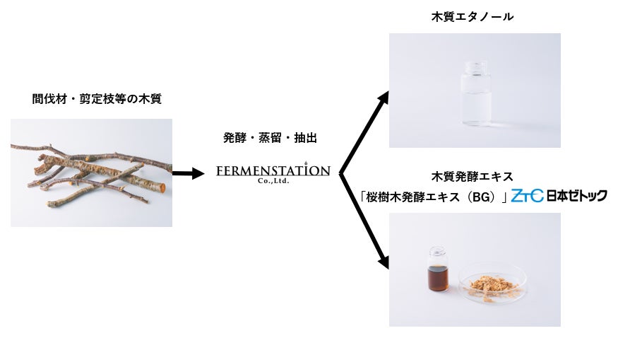 また、日本ゼトック株式会社(本社:東京都、代表取締役社長:神保 貞夫、以下日本ゼトック)と、木質のアルコール発酵時に発生する発酵副産物を活用し、木質発酵エキスを化粧品原料として共同開発しました。対象とした木質は「山桜」の木部で、「桜樹木発酵エキス」として今後販売を予定しております。本取り組みを通じて、木質からエタノールを製造するのみならず、その発酵副産物も余すことなく原料化する取り組みが実現いたしました。
