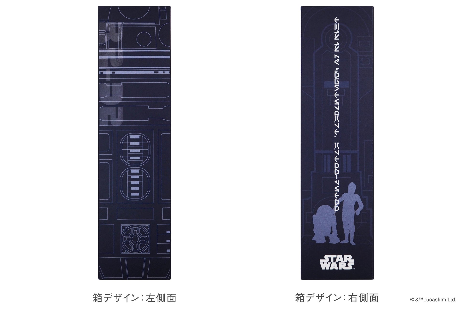箱・ボトル正面に主要キャラクターのアートを施しました。ビジネスパーソンの必需品「スーツリフレッシャー」をライトセーバーに見立て、箱の左側面には各キャラクターが使用するライトセーバーをデザイン。右側面にはそのグリップのグラフィックと、ファンなら解読に挑みたくなるオーラベッシュ文字の名台詞を配しています。