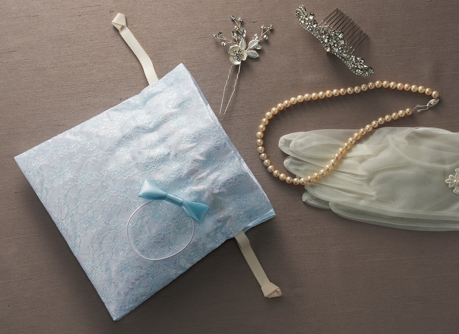 本体(巾着袋)には日本製のレース生地を使用しています。花の模様や光沢が施された生地にリボンを添え、華やかな雰囲気に仕上げています。