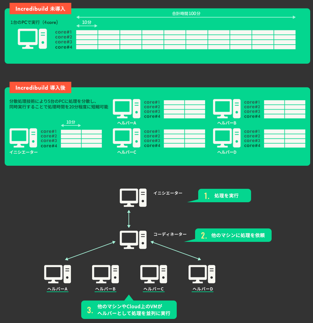 Incredibuildは、ワークロードをローカルエリアネットワークやクラウド内に点在するアイドル状態のCPUへ並列に分散する「仮想化分散処理」と、前回ビルドから変更がない部分(中間ファイル等)はIncredibuild独自にキャッシュした結果を再利用する「ビルドキャッシュ」により、コンパイルやテストなど計算負荷の高いタスクを劇的に高速化するソフトウェアです。独自の仮想化分散処理技術によってリアルタイムにホスト環境をエミュレートしながら、ホストマシンからリモートマシンへのシームレスな処理の分散を可能にします。作業中のマシンでも未使用のCPUリソースがあれば処理を分散することができ、バックグラウンドで動作するため、CPUを供給しているマシンの作業を妨げることもありません。仮想化分散処理によるワークロードの分散によって開発パフォーマンスを大幅に向上し、プロダクトの早期リリースを実現します。