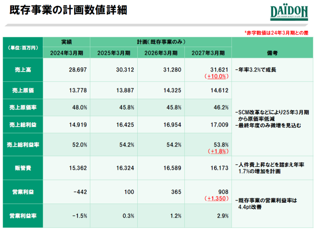 まず、既存事業における27/3期の営業利益目標908百万円は、以下のダイドーの中期経営計画の表から計算すると836百万円(売上総利益17,009百万円-販管費16,173百万円)となるため、内訳若しくは908百万円の数値自体に大きな誤りがあります。また、販管費は「人件費上昇などを踏まえ年率1.7%の増加を計画」としておきながら、27/3期に約▲4億円と大幅に削減されることになっていますが(上記の誤りを修正すると約▲5億円)、その理由についての説明はありません(面談、決算説明会において、SCがこの点をダイドーに質問したところ、「即答できない」と回答されています)。