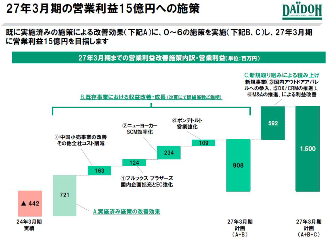 また、営業利益を改善させる新たな施策のうち、改善効果の約半分の金額(592百万円)を新規事業・M&Aに頼っています。特に、M&Aのターゲットは「アパレル関係全般」とされ、「具体的な対象事業・地域等は幅広く検討する」と説明を受けており、全く具体性がありません。