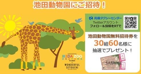 内容:両備タクシーセンターのTwitterアカウント(@ryobitaxicenter)をフォローし、両備タクシーセンターの本キャンペーンについての投稿をRTすると、抽選で動物園の無料招待券2枚セット<30組60名様>プレゼント。
