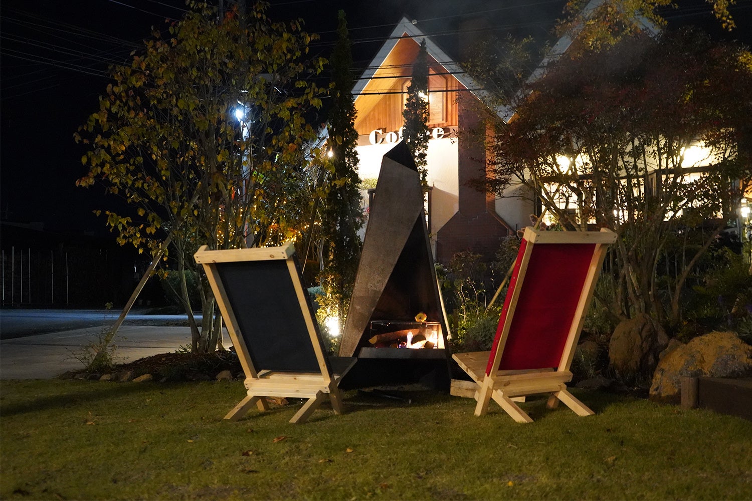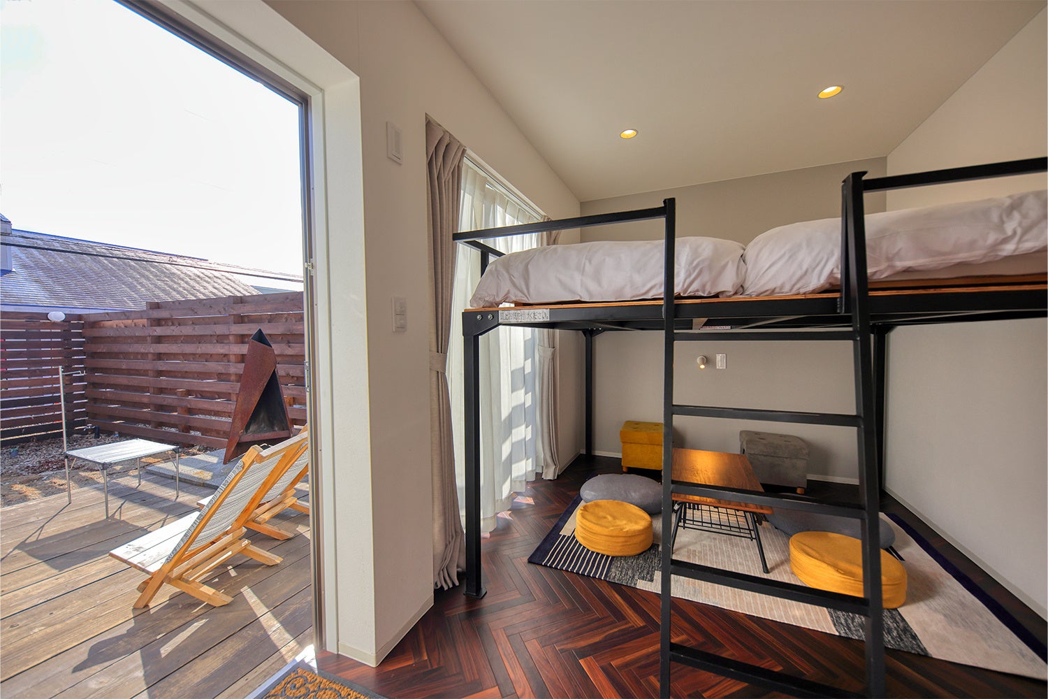 完全独立型のコテージタイプ。定員6名と大人数で宿泊可能なお部屋には100㎡の大きな庭がありテントを張ることも可能となっております。焚き火台も設置しており、夜には揺らめく炎を眺めながら優雅なひとときをお過ごしいただけます。