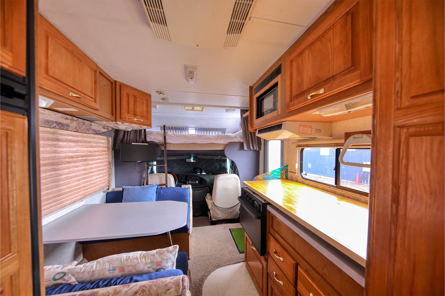 憧れのキャンピングカーでの宿泊。ダブルサイズのベッドが2つ常備されているほかセンターテーブルはソファベッドに組み立て可能なので最大5名様までお泊まりいただけます。