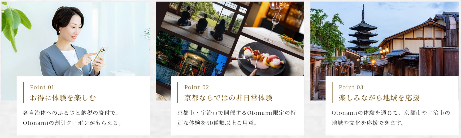 大人のための非日常体験に出会える予約サイト「Otonami(おとなみ)」を展開するJ-CAT 株式会社(本社:東京都中央区、代表取締役:飯倉 竜 以下、J-CAT)は、大阪ガス株式会社(本社:大阪府大阪市、代表取締役社長:藤原 正隆 以下、大阪ガス)および株式会社ギフティ(本社:本社:東京都品川区/代表取締役:太田 睦、鈴木 達哉/以下、ギフティ)が協業のもと「旅先納税®︎」※システムを活用し展開する「関西おでかけ納税®」※と連携し、「Otonami」で提供する京都市・宇治市の文化体験を、ふるさと納税の返礼品として楽しめる、新しい取り組みをスタートいたしました。