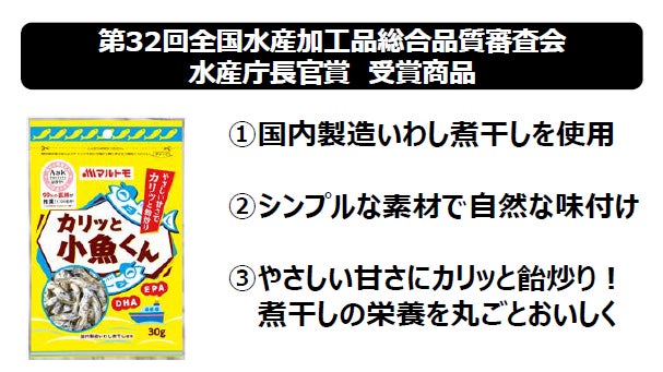 本キャンペーンは、第32回全国水産加工品総合品質審査会(※1)において「カリッと小魚くんⓇ30g」が水産庁長官賞を受賞したことを記念して実施するもので、マルトモ公式Instagram 【@purebushi_marutomo】において本キャンペーン投稿に「いいね」をし、【@purebushi_marutomo】をフォローすることでご応募いただけます。※1:全国で生産されている水産加工品等の品質向上を図り、あわせて水産加工業者の生産、技術、販売への意欲向上に寄与することを目的とし、農林漁業振興会の実施する農林水産祭の一環として行われるもの。
