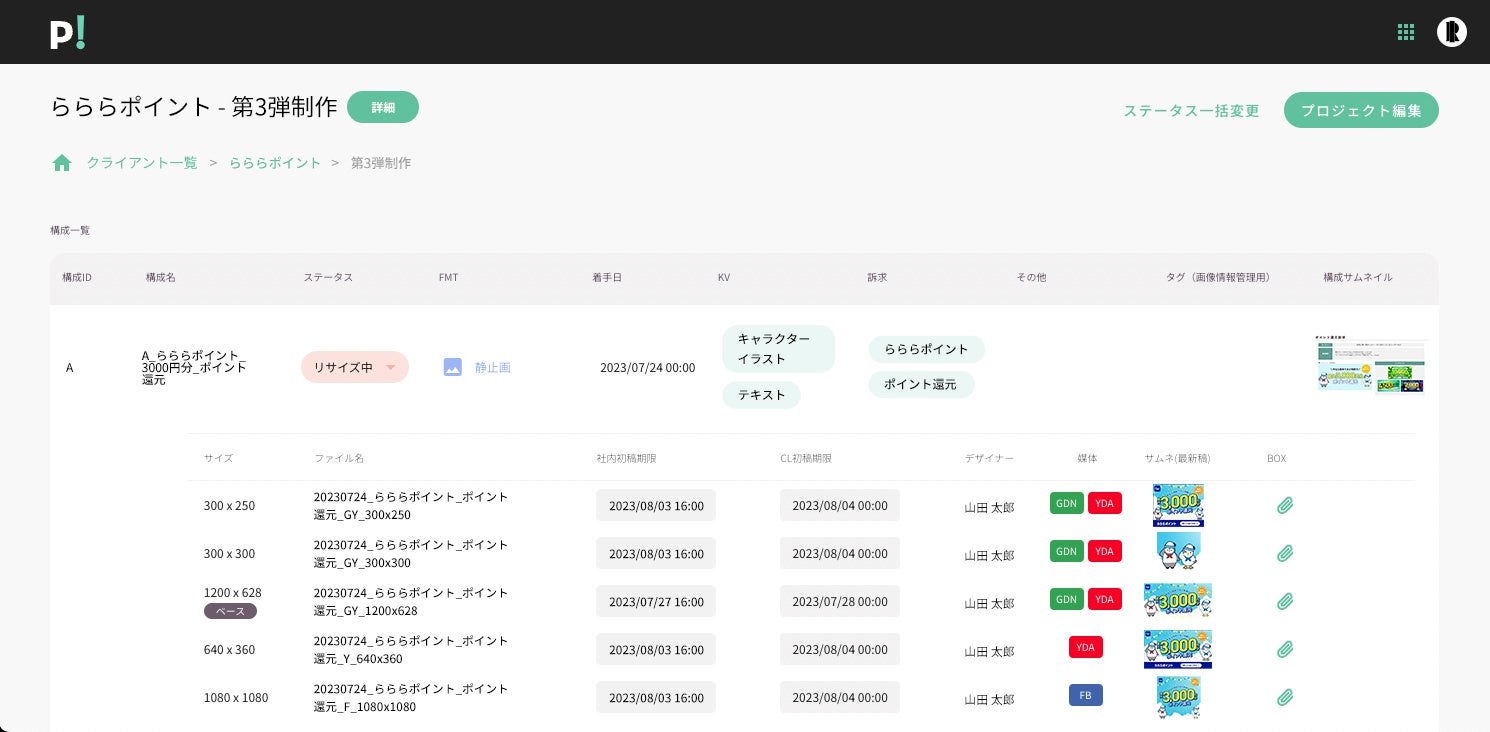 過去に制作したデザインデータを一元管理することで、必要な情報へスピーディーにアクセスでき、これまでのクリエイティブPDCAを一挙に確認できます。ファイル名の自動生成、案件単位でのクラウドストレージへの自動フォルダ生成・保存などをシステムによって自動的におこない、ファイル生成に係る作業時間をゼロにすることを実現します。