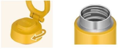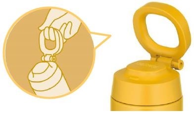 キャリーループはスクエア型のリングで、指がかかりやすい形状。フタ部分に収まる設計で、リングを使わないときは折り畳んでコンパクトに収納できるのが特長です。フタは、しっかり閉まるスクリュータイプ。シンプル構造でパーツが少なく、お手入れもカンタン。飲み口は、口当たりの良い丸みを帯びた金属製の飲み口です。本体は、ステンレス製魔法びん構造の高い保温・保冷力で飲み頃温度をキープし、結露もしません。