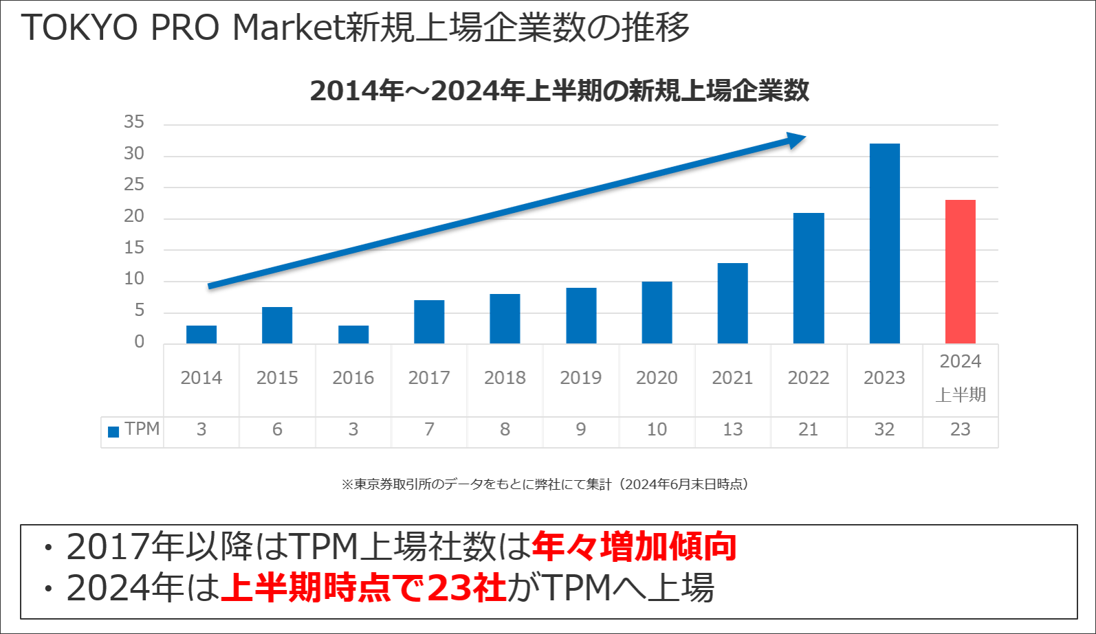 実際に、TOKYO PRO Market(東京プロマーケット)の上場企業数は年々増加傾向にあり、2024年1月~6月で23社が新規上場しており、2024年6月末時点では110社が上場しております。