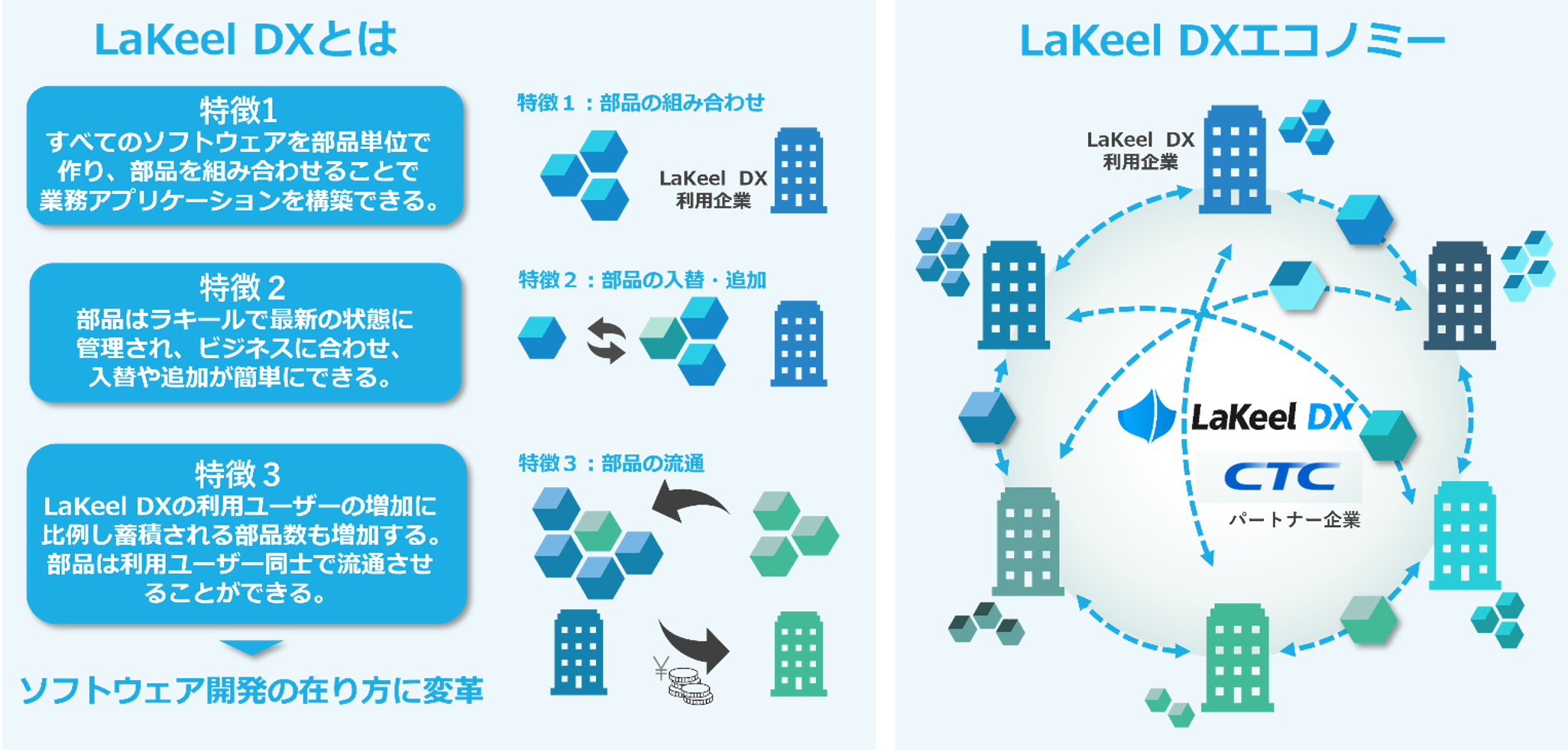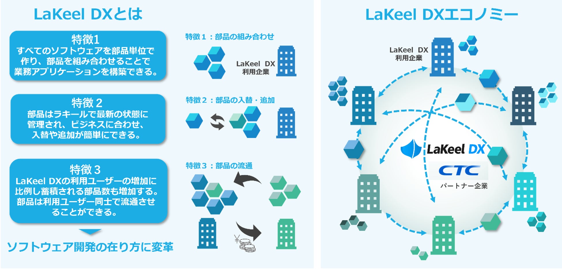 今後両社は、LaKeel DXを利用するユーザーが開発したアプリケーションの流通を支援する環境「LaKeel DXエコノミー」の展開を視野に入れ、新たなビジネスモデルの創出を進めていきます。