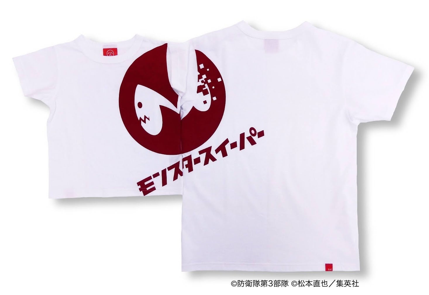 主人公の日比野カフカが勤務する怪獣専門清掃業者、「モンスタースイーパー」社のロゴマークをTシャツのフロントからバックにかけてデザイン。清掃作業時のユニフォームを連想させる、白ベース×ロゴの組み合わせになっています。
