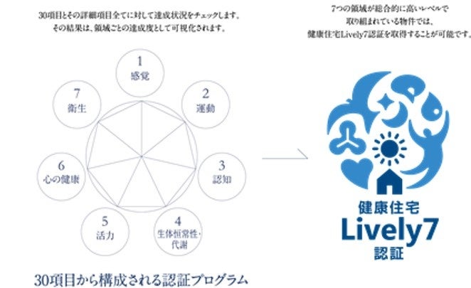 「健康住宅Lively7認証」は、ウェルビーイングに対する人々の関心に応え、心身の健康に寄与する快適な住環境の基準を提示するものさしとして提供されている住宅向けの認証プログラムです。疲労医学、地域社会医学等の第一線で活躍する研究者、専門家で委員会が組織されており、エビデンスに基づく専門家の知見を踏まえた7領域30項目からなる評価項目をもとに、住まう人の健康に良い影響を与え得るかという視点から物件を評価、3段階のグレード(プラチナ、ゴールド、シルバー)で認定※1されます。