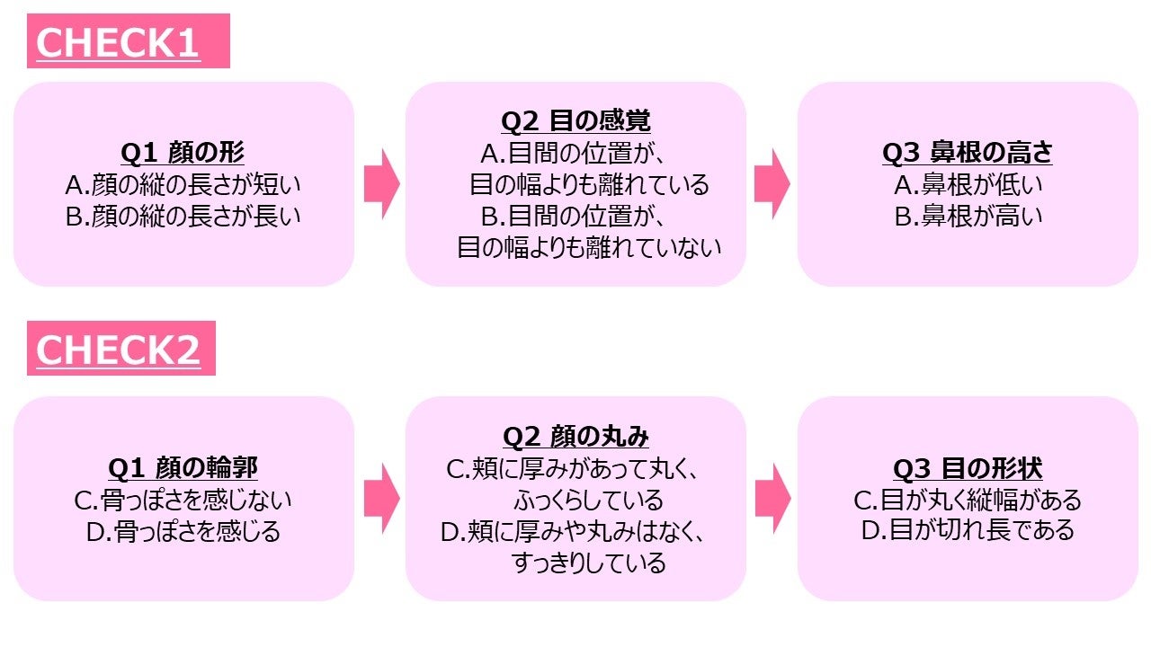 ②CHECK1とCHECK2の結果を組み合わせて、チャートから顔型を診断します。