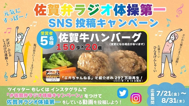 佐賀市ふるさと納税返礼品で人気の特産品【佐賀牛ハンバーグ】がもらえる「佐賀弁ラジオ体操第一SNS投稿キャンペーン」を開催します。