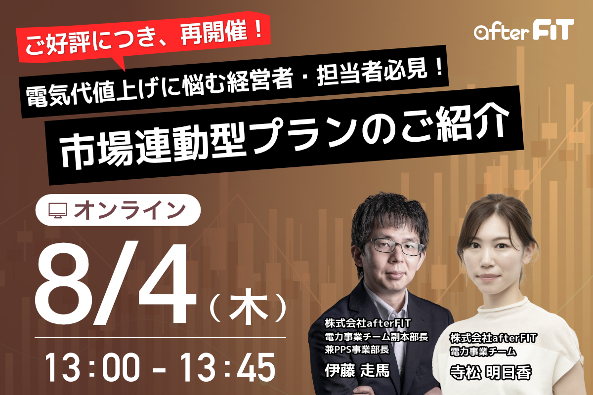 グリーンに特化した電力サービスの「しろくま電力(ぱわー)」を運営する株式会社afterFIT(東京都港区、代表取締役:谷本貫造)は、電力価格高騰に伴う大幅な値上げや、解約などの「電力難」にさらされる特別高圧・高圧需要家向け企業へ、市場連動型メニューの提供を開始しました。そこで7月に開催した無料オンラインセミナーが大変ご好評いただいたため、2022年8月4日(木)に再演致します。本セミナーでは、日本電力取引所(JEPX)に連動し電力供給を行うその仕組みと、メリット・デメリットについて解説します。
