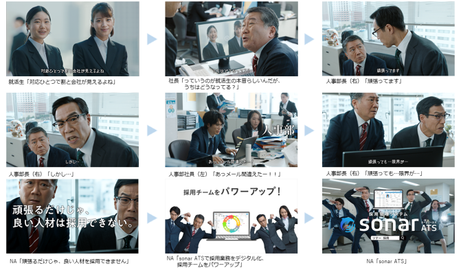 本CMは、2021年11月に放送した「sonar ATS」TVCMの後日談です。合同就職説明会に参加した後の就職活動中の学生(以下、就活生)のCMを見て、就活生の本音を知った、とある会社の社長。気になった社長は、隣にいる人事部長に尋ねます。