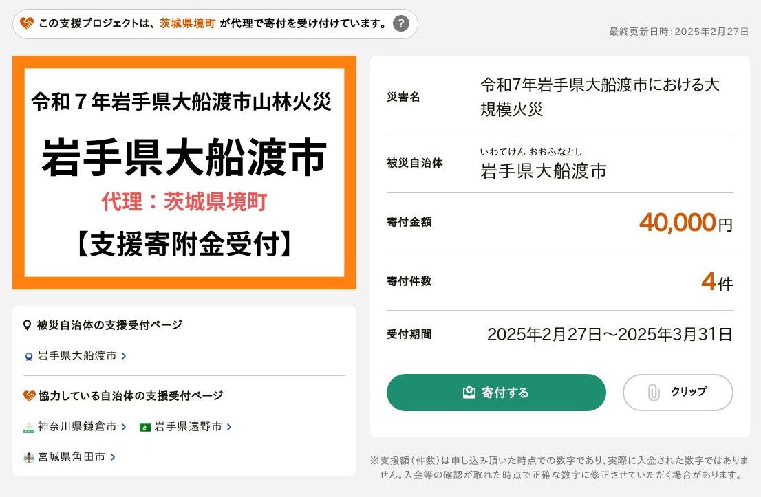 【茨城県境町】令和7年2月 岩手県大船渡市 大規模火災のふるさと納税代理寄附受付を開始