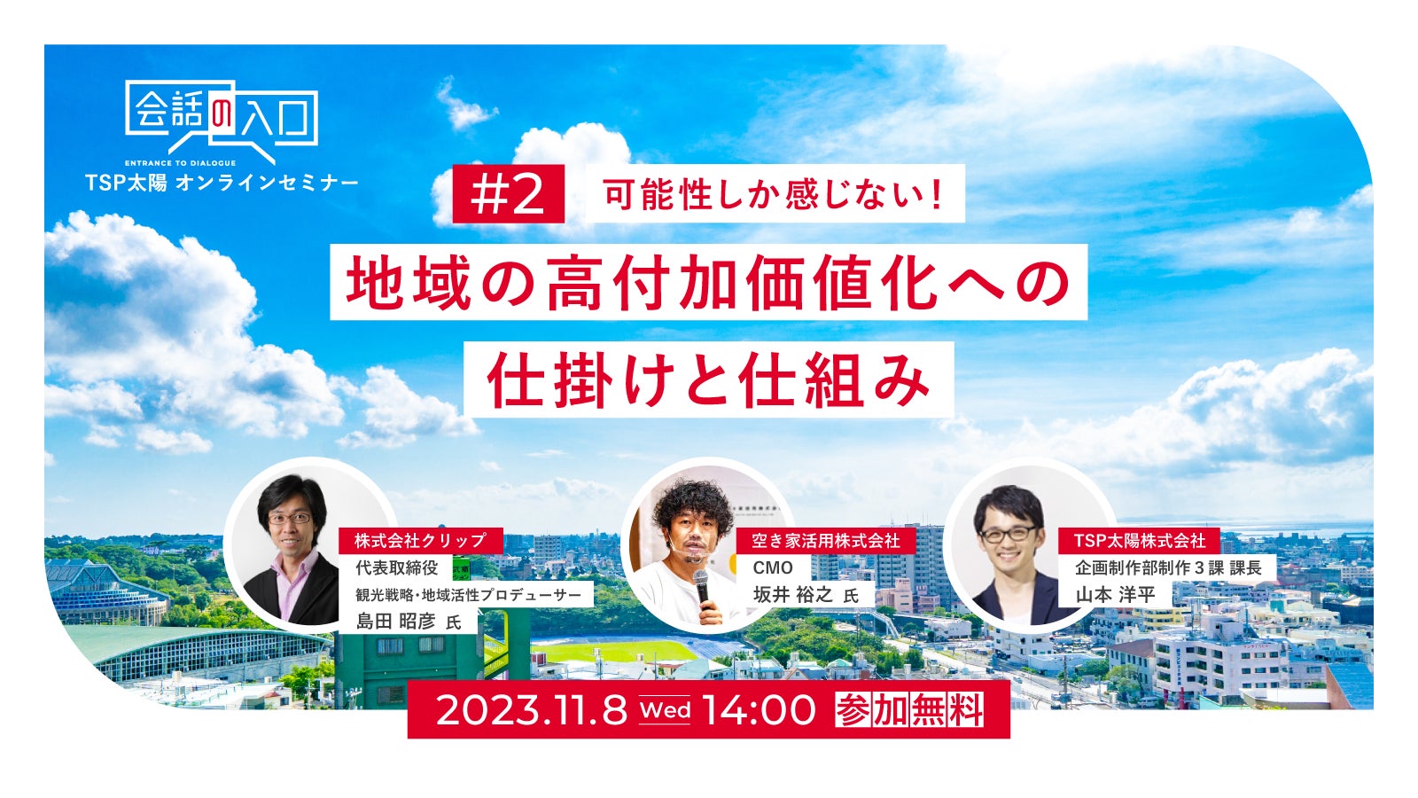 【TSP太陽オンラインセミナー】『可能性しか感じない! 地域の高付加価値化への仕掛けと仕組み』を11/8(水)に開催
