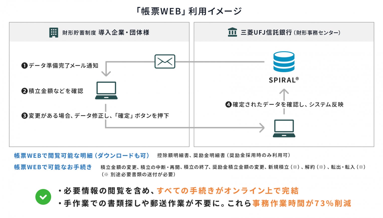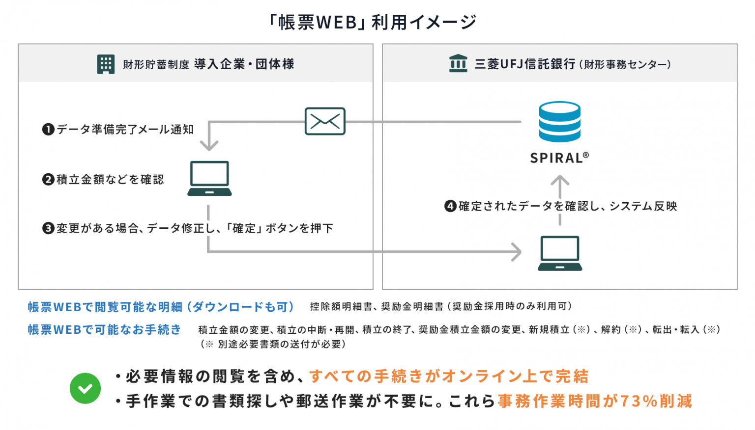 本システムは、導入企業および団体での加入者の控除額明細書と奨励金明細書の確認および変更作業をオンラインで完結できます。また、三菱UFJ信託銀行の財形貯蓄データ管理システムと連携することにより、データの突合や照会の自動化も実現しました。