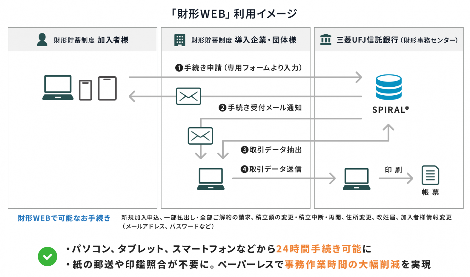 「財形WEB」では、加入者と導入企業および団体が、財形貯蓄に関する手続きをパソコンやスマートフォン、タブレットから24時間いつでもどこでもオンラインでおこなうことが可能となり、利便性が向上しました。