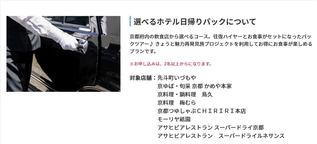 京都府内の飲食店から選べるコース。往復ハイヤーとお食事がセットになったパックツアー♪ きょうと魅力再発見旅プロジェクトを利用してお得にお食事が楽しめるプランです。