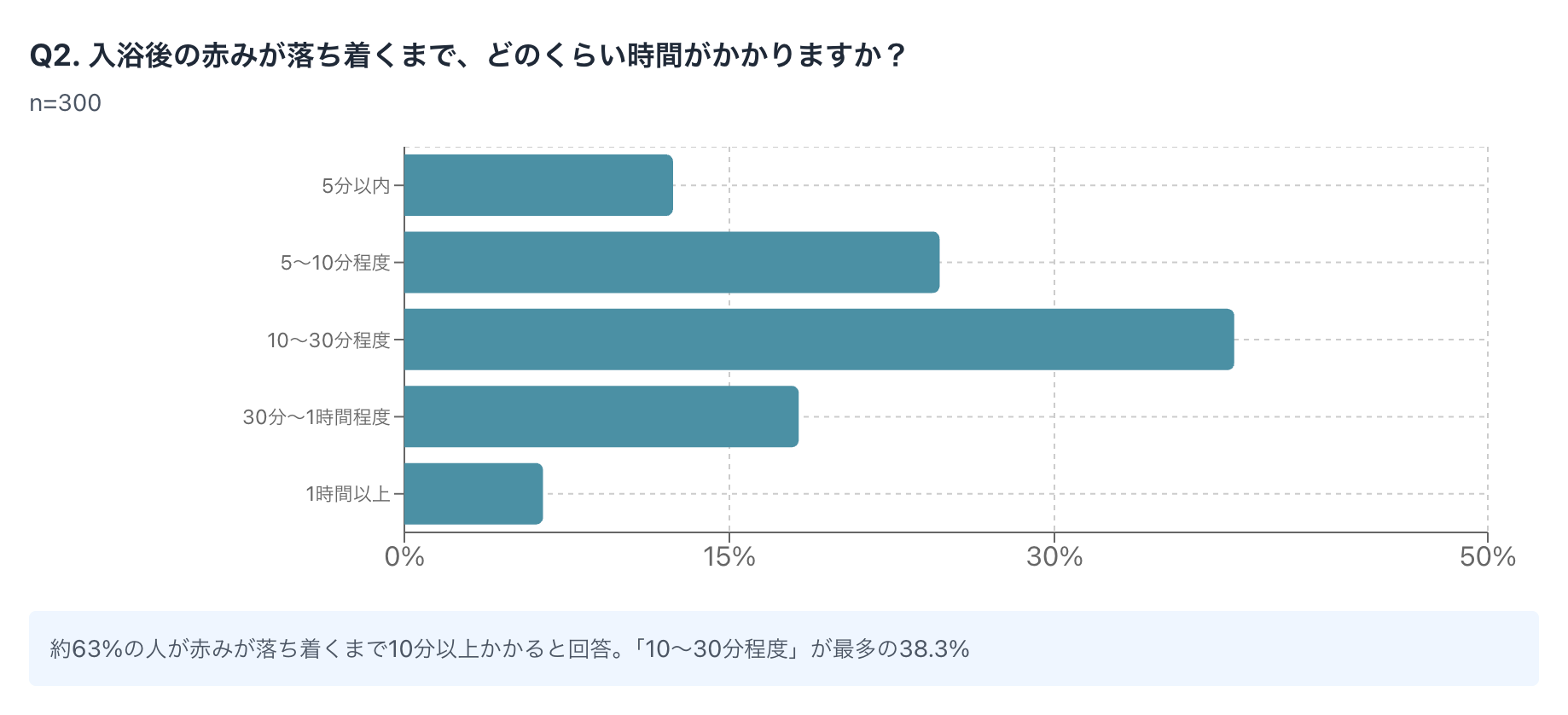 その結果、約9割の方が入浴後に顔が赤くなり、約6割の方が赤みが落ち着くまで10分以上かかることが判明しました。また、約7割が41℃以上の熱いお風呂を好む一方で、同じく約7割が高温入浴の肌負担を認識していないという「認識ギャップ」が明らかになりました。