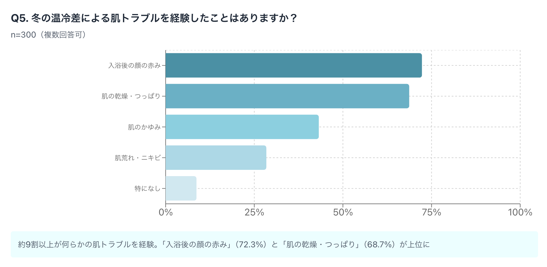 その結果、「入浴後の顔の赤み」が最多の72.3%、次いで「肌の乾燥・つっぱり」68.7%、「肌のかゆみ」43.2%という結果になりました。「特になし」はわずか8.7%で、約9割以上の方が何らかの肌トラブルを経験していることがわかりました。