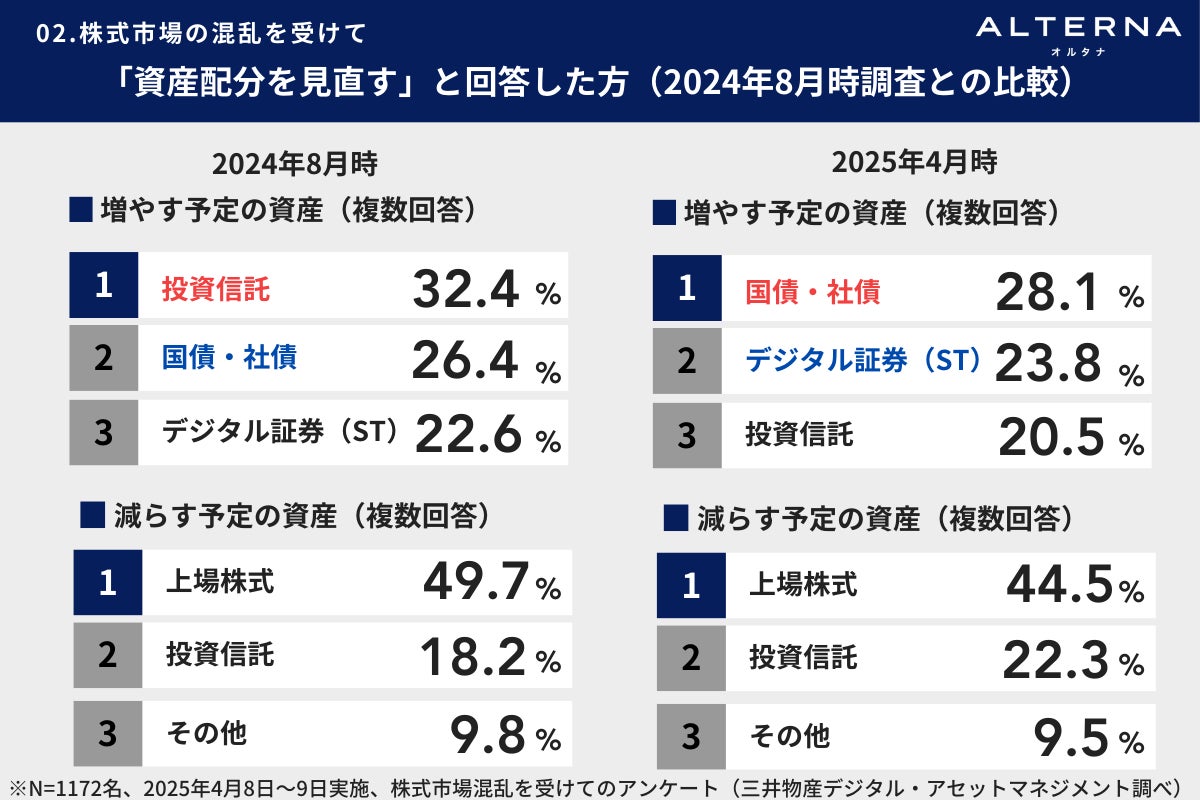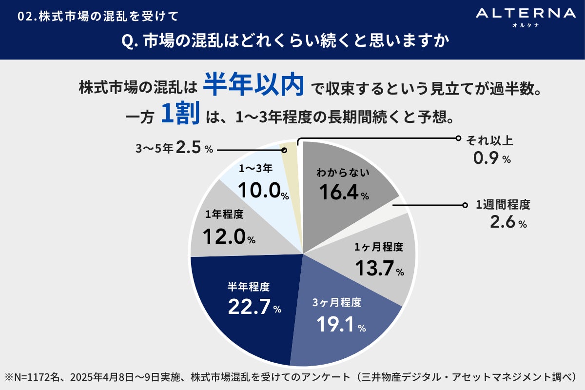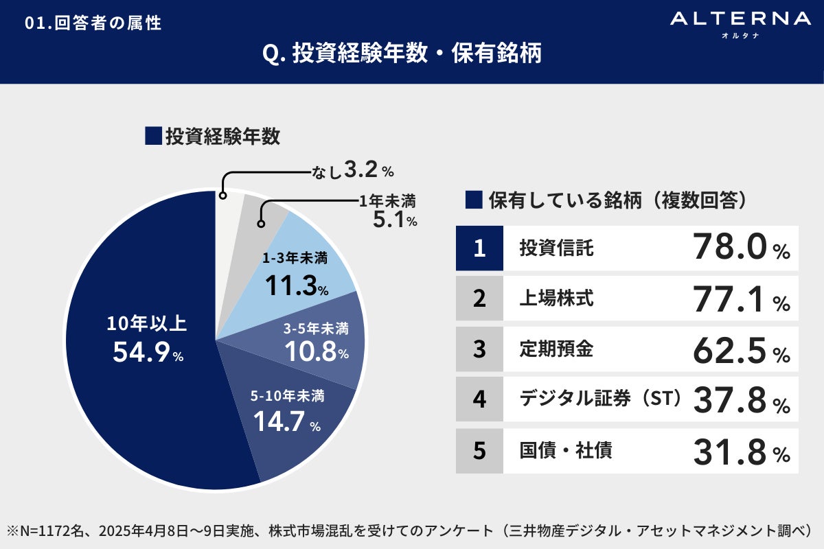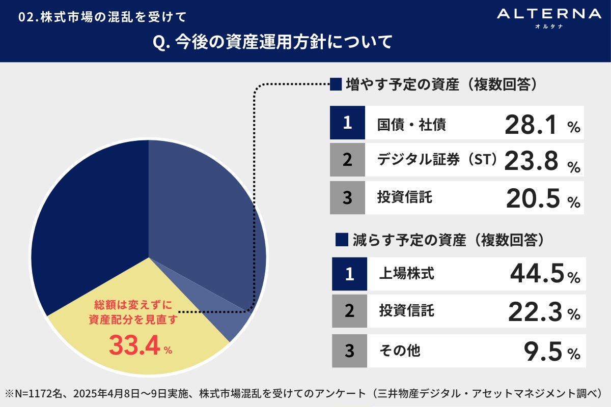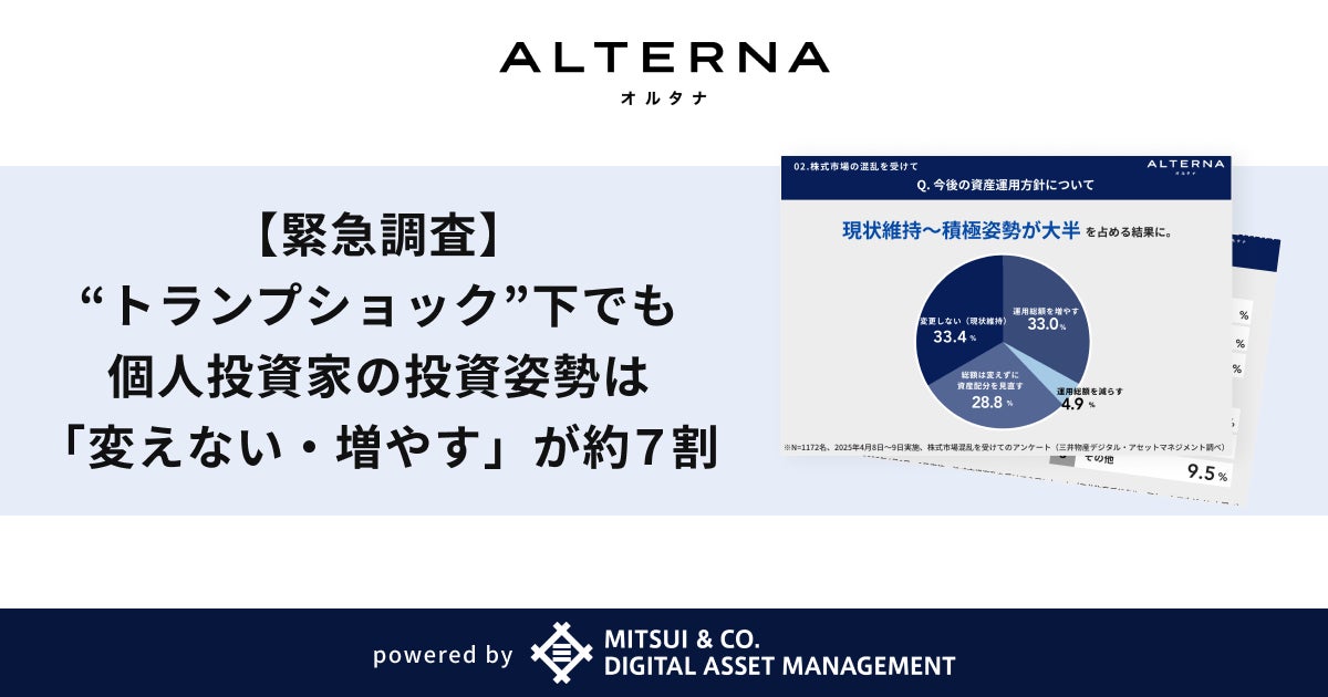 デジタル証券を活用した安定資産投資サービス「ALTERNA(オルタナ)」を提供する三井物産デジタル・アセットマネジメント株式会社(以下「当社」)は、先週からの株式市場や為替等の大幅な変動を受け、個人投資家における投資姿勢についてアンケートを実施しましたのでお知らせします。